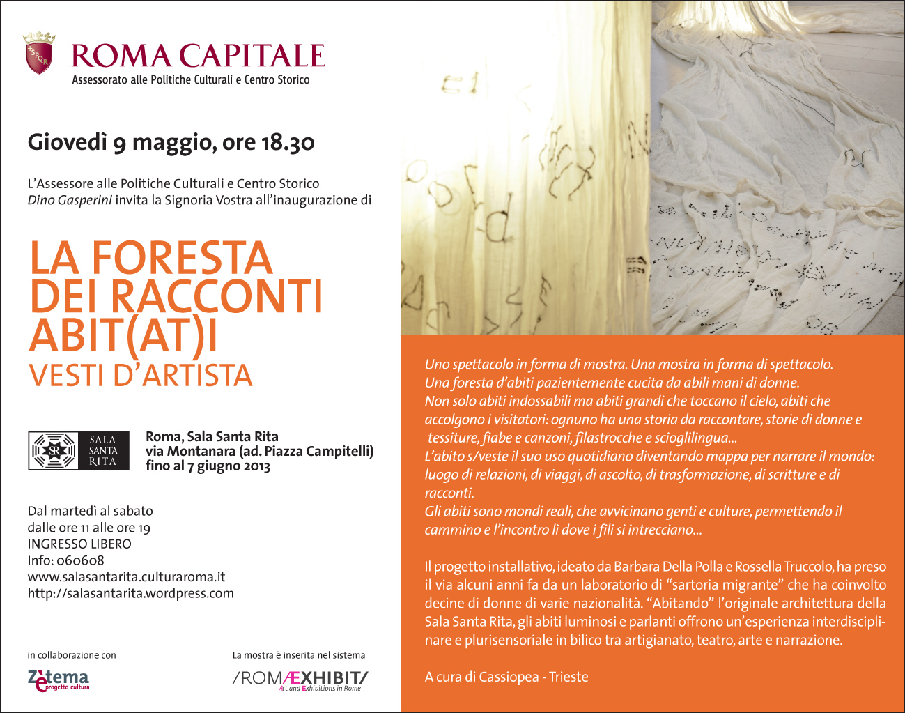 La foresta dei racconti abi(ta)ti, progetto installativo ideato da Barbara Della Polla e Rossella Truccolo, ha preso il via alcuni anni fa da un laboratorio di “sartoria migrante” che ha coinvolto decine di donne di varie nazionalità ed è una particolare commistione di più generi espressivi.