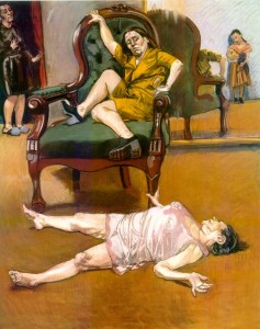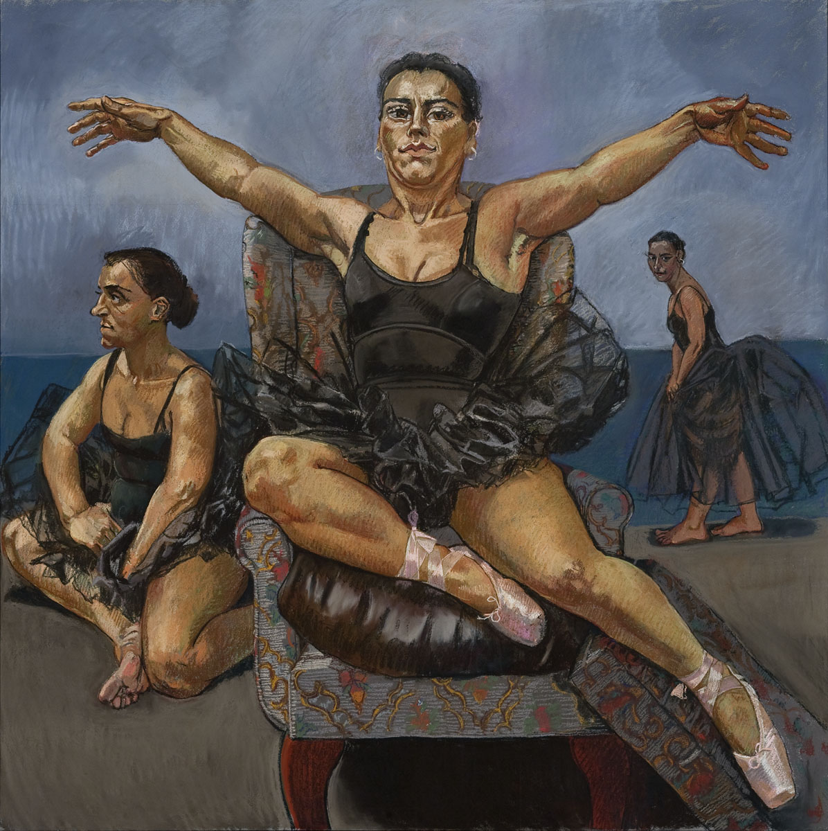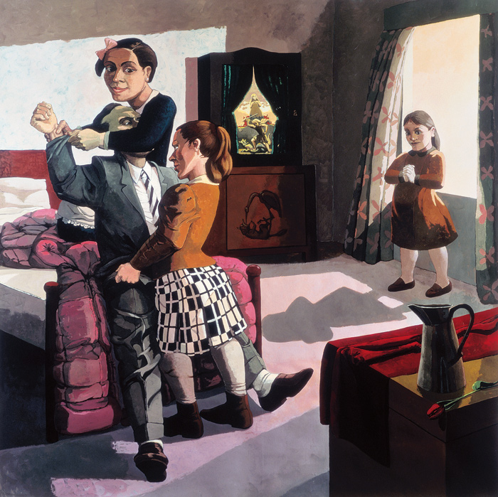 Anche la famiglia è presentata come teatro di situazioni oppressive e violente, di contrasti emozionali, tensioni sessuali e giochi di potere. E così Rego rivela e mette a nudo, con intenzione politica e non di giudizio morale3, gelosie e tradimenti, minacce e umiliazioni, colpe e desideri. Le relazioni umane che ne risultano sono espresse prevalentemente nei termini di contrapposizione e conflitto: fra uomini e donne e fra donne, fra adulti/e e bambine, fra chi ha il potere e chi è sottomesso, secondo modalità del discorso sempre fortemente e volutamente ambigue, vuoi per i personaggi, vuoi per i contesti e i riferimenti che mette in scena. E in questo gioco di svelare e smascherare -sentimenti e situazioni-, si precisa e prende forma anche la crisi dell’autorità maschile, come in Bambine e cani, 1986; Le serve, 1987 e, in particolare, le due grandi opere del 1988 La famiglia e La danza.
