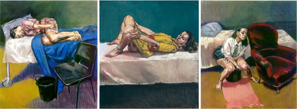 In contesti estremamente semplificati, l’attenzione è tutta concentrata sulle figure: corpi, come sempre, potenti, massicci e muscolosi, che assorbono e dominano lo spazio. Si tratta di donne che, sia pure nella sofferenza, sono l’unico soggetto dell’azione. L’intento, in sostanza, non è (non solo) denunciare un grave problema sociale, quanto sottolineare, anche in questa condizione estrema, la determinazione soggettiva della donna, il controllo sulle proprie scelte. Paula Rego sceglie due pose differenti ma concettualmente complementari: le figure sono o rannicchiate su se stesse oppure rivolte verso chi guarda ma, in entrambi i casi, l’autrice evidenzia il pieno controllo della donna sull’evento, il suo essere protagonista, mai vittima delle circostanze.