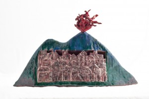 Come nei nuovi Vesuvi. Uso il plurale, perché da tempo Marina Cianetti lavora intorno al Vesuvio, ne ha disegnato un profilo inconfondibile, identificato da quel filo di fumo che si aggiunge, a mo’ di ornamento sbarazzino, alla silhouette della montagna. I nuovi Vesuvi sono decisamente abitati. Il ventre misterioso del vulcano ospita interi villaggi.