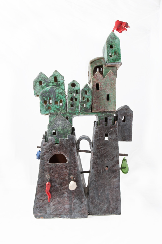 Sono pezzi lavorati e ri-lavorati, queste terre di Marina, la cui generosità e segno lieve e incisivo conoscono bene le lettrici di una rivista come Leggendaria. Terre cotte più volte, a volte smaltate, a volte no, incastri audaci, solidi e leggeri. Sono mondi, ci si incanta a guardarli, a inseguire le ombre dietro le piccole porte, la consistenza di ogni frammento, di ogni insieme di case che si fa paese, luogo vissuto. Non ci sono umani, in queste terre, ma ce ne sono tracce evidenti.