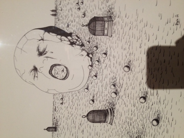 Tra le artiste vicine al Surrealismo, che interrogano figure nuove di donne e mettono in discussione ruoli sessuali e stereotipi, impressiona una foto di Dora Maar, Père Ubu, (1936), un feto di armadillo con le zampette ripiegate in avanti vicino al volto, un mostro sconcertante che trova nel titolo il riferimento a Ubu re, avido e volgare protagonista patriarcale di Alfred Jarry. O le immagini del 1946 di Toyen (Marie Čermínová), esponente importante della corrente praghese ma attiva anche a Parigi, che esprime nelle sue opere la desolazione di un paesaggio desertico, lo sgretolamento di una testa vuota di bambino che piange in mezzo a gabbie e gusci d’uovo immobili o forse rotolanti. Una figurazione dell’Europa a fine guerra di marcata disgregazione, resa ancora più incisiva dal tratto nero del disegno.
