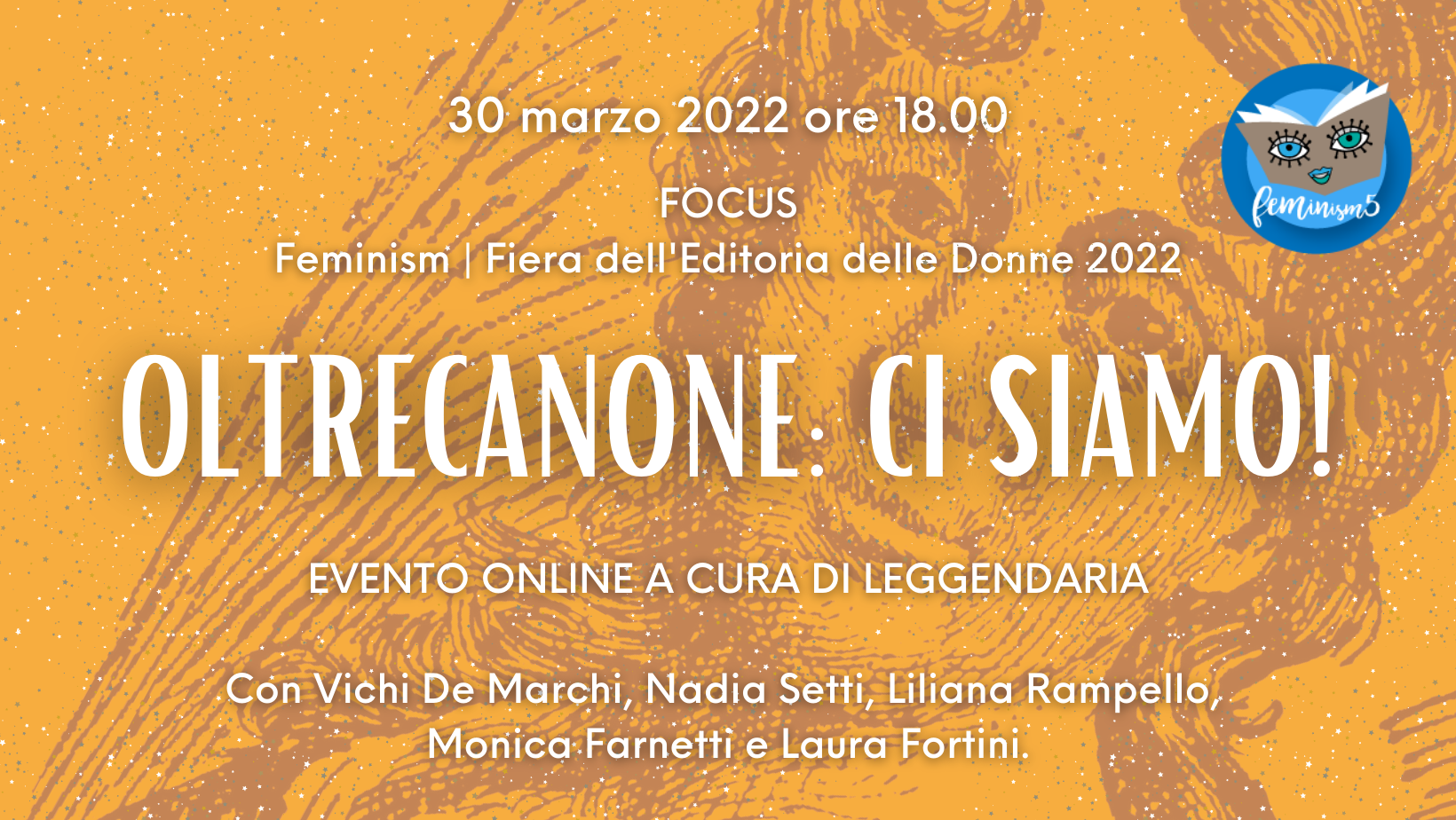 Il 30 marzo 2022 alle ore 18.00 in diretta sui canali social di Feminism | Fiera dell’Editoria delle Donne andrà in onda “OLTRECANONE: CI SIAMO!“, il primo focus della V edizione curato dalla rivista Leggendaria. Con Anna Maria Crispino discuteranno Vichi De Marchi, Nadia Setti, Liliana Rampello, Monica Farnetti e Laura Fortini.