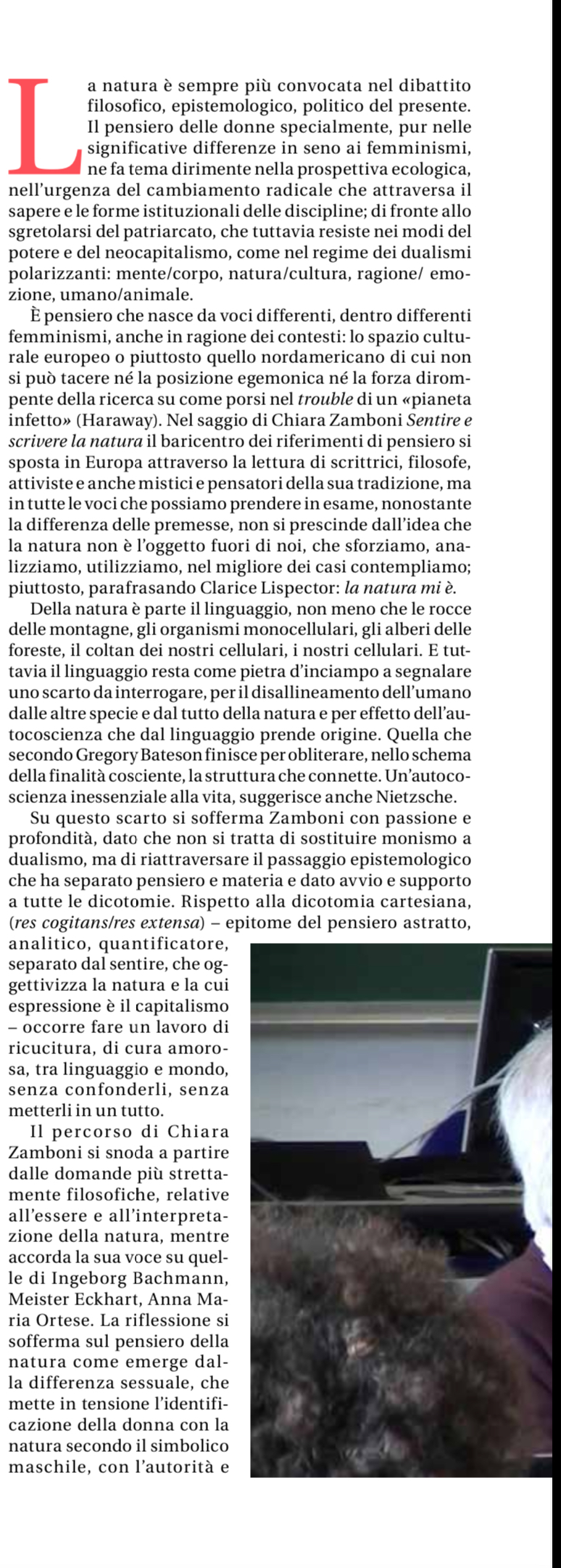 A partire dal Sentire e scrivere la natura, l’ interrogazione del rapporto tra linguaggio, realtà, soggettività si giova delle parole di importanti voci del Novecento, da Ingeborg Bachmann a Merleau- Ponty, da Laura Conti a Ortese e Zambrano per cogliere come il mondo tutto vivente e non vivente, esseri animati e cose è coinvolto nel divenire della natura e lo significa.