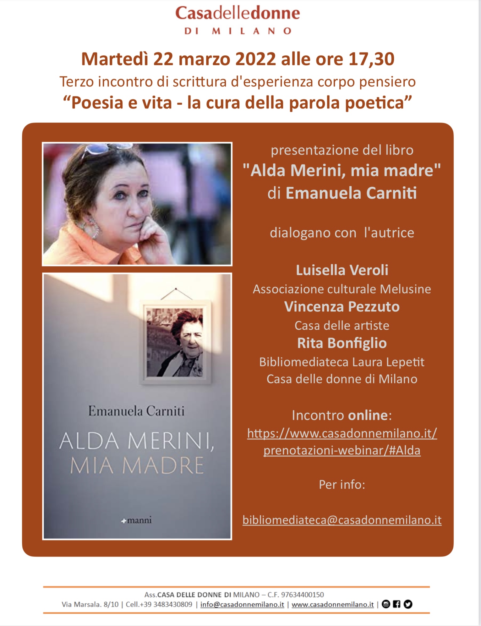 In dialogo con Emanuela Carniti, esploriamo con lei nel suo libro Alda Merini, mia madre e nella sua testimonianza di vita come figlia e scrittrice, una figura di Alda Merini poeta intensamente vitale, che attraverso la poesia ‘si mette al mondo’, con tutta la sua esperienza quotidiana di prove forti, dolorose o felici, in una continua libertà creativa e umana, in cui la poesia è potenza unitaria. E insieme molteplice e vasta, punto d’incontro fra soggettività profonda e realtà esterna, conoscenza nuova insieme interiore ed esteriore, metamorfosi del reale, in questo facendosi cura di sé e del mondo. Nel modo particolare di Alda, che ugualmente si propone ai letterati e alla gente di quartiere, lei marginale ed elitaria, nella sua conoscenza e coscienza di sé, al di là dei condizionamenti sociali.