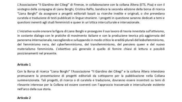 L’Associazione “Il Giardino dei Ciliegi” di Firenze, in collaborazione con la collana Àltera (ETS, Pisa) e con il sostegno della compagna di Liana Borghi, Cristina Raffo, bandisce la seconda edizione della borsa di ricerca “Liana Borghi” da assegnare a progetti editoriali basati su ricerche inedite e originali, o che prevedano curatela e traduzione di testi pubblicati in lingue straniere. I progetti in questione saranno dedicati a temi e questioni inerenti agli studi femministi e queer in un’ottica interculturale e intersezionale.