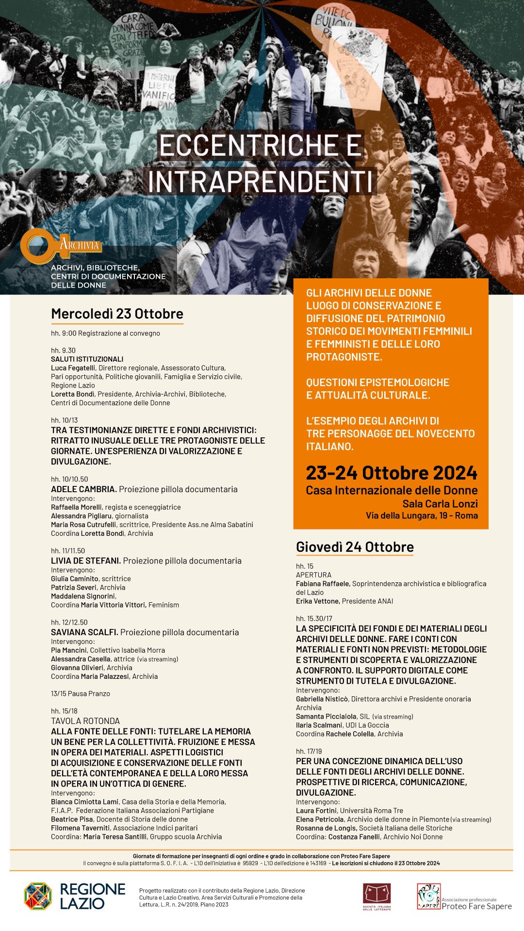 Mercoledì 23 ottobre e giovedì 24 ottobre, nella sala Carla Lonzi della Casa Internazionale delle donne di Roma, si terrà “Eccentriche e Intraprendenti” un evento che riporta al centro l’importanza degli archivi, le biblioteche e i centri di documentazione delle donne.