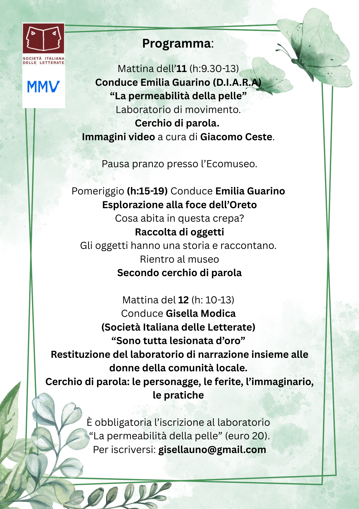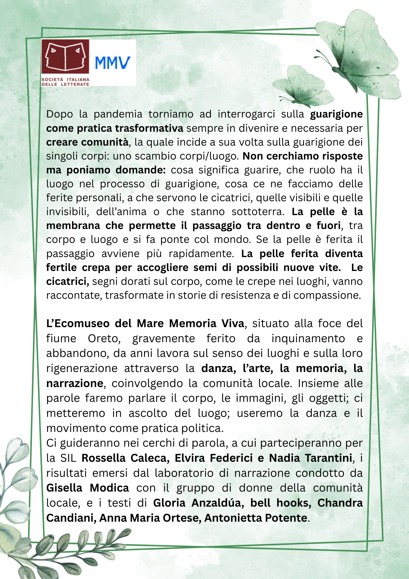 L’Ecomuseo del Mare Memoria Viva, situato alla foce del fiume Oreto, gravemente ferito da inquinamento e abbandono, da anni lavora sul senso dei luoghi e sulla loro rigenerazione attraverso la danza, l’arte, la memoria, la narrazione, coinvolgendo la comunità locale. Insieme alle parole faremo parlare il corpo, le immagini, gli oggetti; ci metteremo in ascolto del luogo; useremo la danza e il movimento come pratica politica. Ci guideranno nei cerchi di parola, a cui parteciperanno per la SIL Rossella Caleca, Elvira Federici e Nadia Tarantini, i risultati emersi dal laboratorio di narrazione condotto da Gisella Modica con il gruppo di donne della comunità locale, e i testi di Gloria Anzaldua, bell Hooks, Chandra Candiani, Anna Maria Ortese, Antonietta Potente.