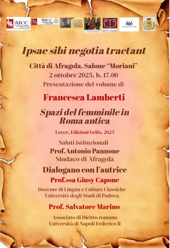 Giovedí 2 ottobre 2025, nel Salone “Moriani” di Afragola (NA) si terrá la presentazione del volume Spazi del femminile in Roma Antica (Lecce, Edizioni Griffo, 2025) di Francesca Lamberti.