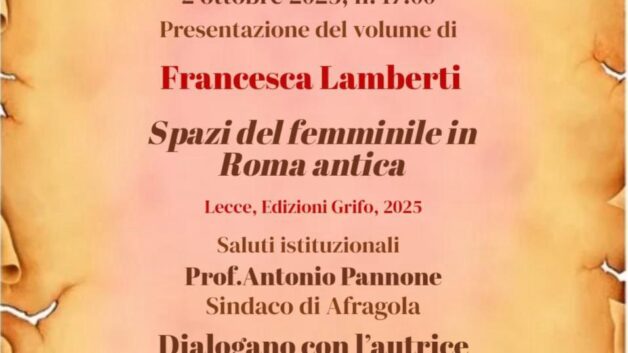 Giovedí 2 ottobre 2025, nel Salone “Moriani” di Afragola (NA) si terrá la presentazione del volume Spazi del femminile in Roma Antica (Lecce, Edizioni Griffo, 2025) di Francesca Lamberti.